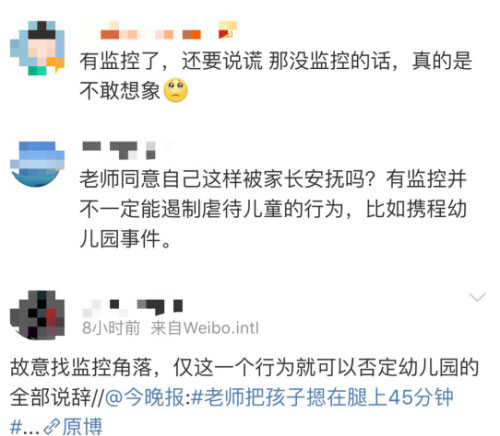3月26日消息,据人民网微博3月25日报道,21日一女士称花费2万多元让两岁半的女儿上托班,被老师摁在腿上45分钟,受到不友好对待。22日园方回应,该动作是处理分离焦虑的方法,是在安抚孩子,避免孩子弄伤自己。园内监控视频随即流出,从监控中可以清晰看到老师和幼儿的举动,当天播放量已达到170万次。目前,涉事老师已停职。