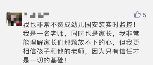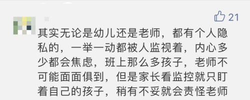 对安装无死角监控,有人表示支持,认为有了监控之后能够震慑老师的言行,消除家长的疑虑和不信任,也有人表示担忧。一位幼儿园老师称,自己在监控下仿佛戴上了“镣铐”,无死角的监控影响了正常教学活动,而孩子们的隐私权也正面临风险。