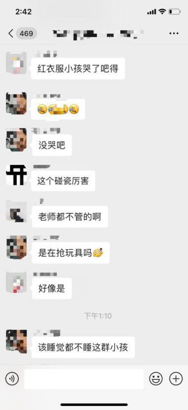 一位不愿透露姓名的家长向记者展示了家长们查看无死角监控之后,微信群内家长对幼儿园老师和学生的行为进行的实时“点评”。